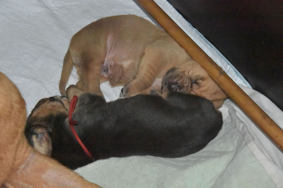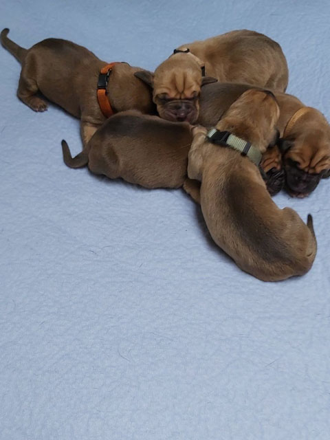 4 males & 3 females born 16 March 2022 4 reutjes & 3 teefjes geboren op 16 maart 2022 1 black & tan male, 3 red males & 3 red females 1 black & tan reutje, 3 rode reutjes & 3 rode teefjes ![]() 7 weken oud - 7 weeks old: